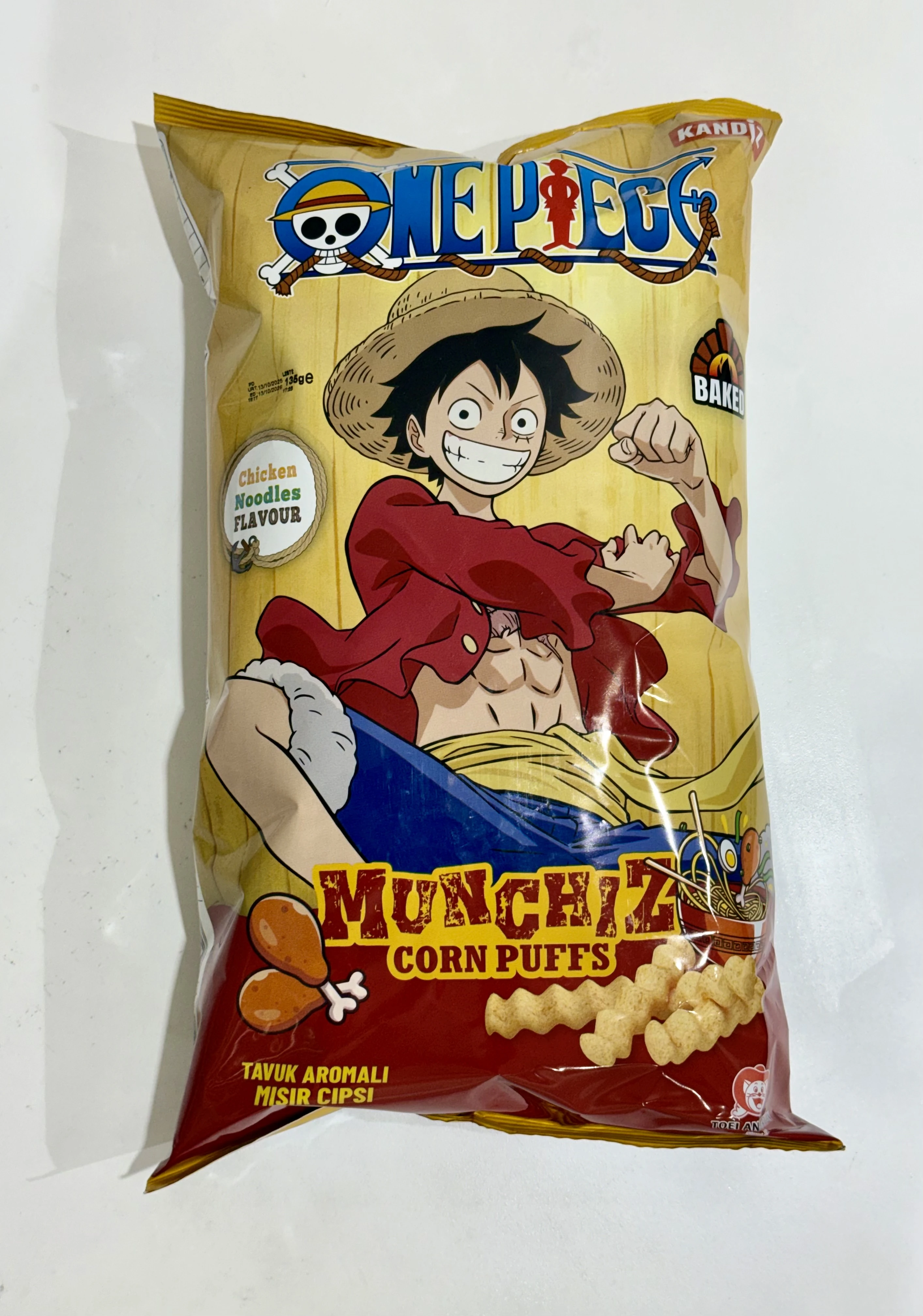 رقائق الذرة المقرمشة بشخصية مونكي دي لوفي من ون بيس، بنكهة دجاج ونودلز.