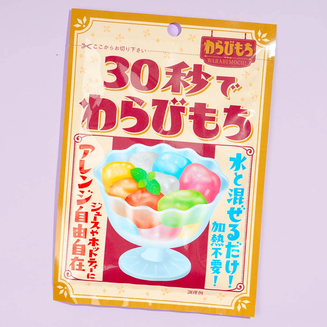 وارابيموتشي هو نوع من الواغاشي (حلوى يابانية تقليدية) مصنوع من نشا السرخس المغطى بمسحوق فول الصويا المحمص. الآن يمكنك تحضير وارابيموتشي بنفسك باستخدام هذه المجموعة. كل ما عليك فعله هو خلط مسحوق وارابيموتشي بالماء أو العصير أو الشاي الساخن. يمكنك تناوله بمفرده أو إضافته إلى الحلويات الأخرى مثل الآيس كريم!